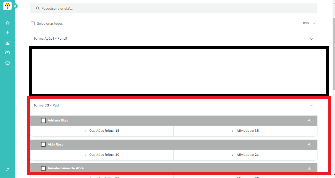 Segunda maneira: Clique na turma desejada e abrirá a lista dos alunos que compõem a turma, role a seta do mouse para encontrar o aluno desejado.