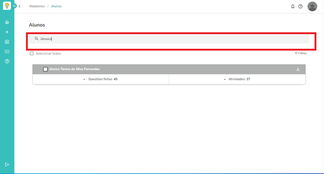 Primeira maneira: Na lupa, escreva o nome do aluno. Logo, automaticamente, mostrará a lista com os nomes. Assim, você pode digitar o nome completo do aluno que deseja verificar o relatório de desempenho.