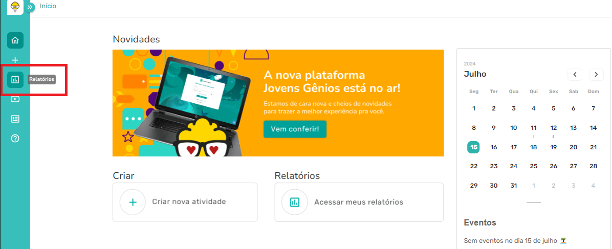 Você também pode usar a barra lateral esquerda e clicar em “relatórios”;